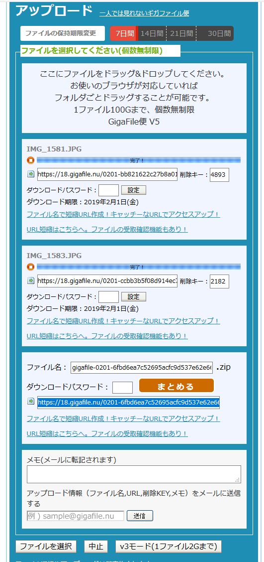 ドラッグ&ドロップをしてアップロードしたら、続けて他のデータをドラッグ&ドロップしてください。上の画像のように、アップロードしたデータ分だけ青い棒グラフと「ダウンロードURL」が繰り返し表示されます。